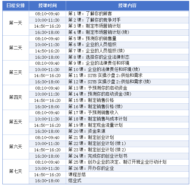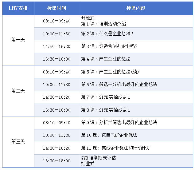 GYB培训结束后,获得《GYB合格证书》的学员可免费参加SYB创业培训班(7天深度实战,含市场评估、利润计划等)。