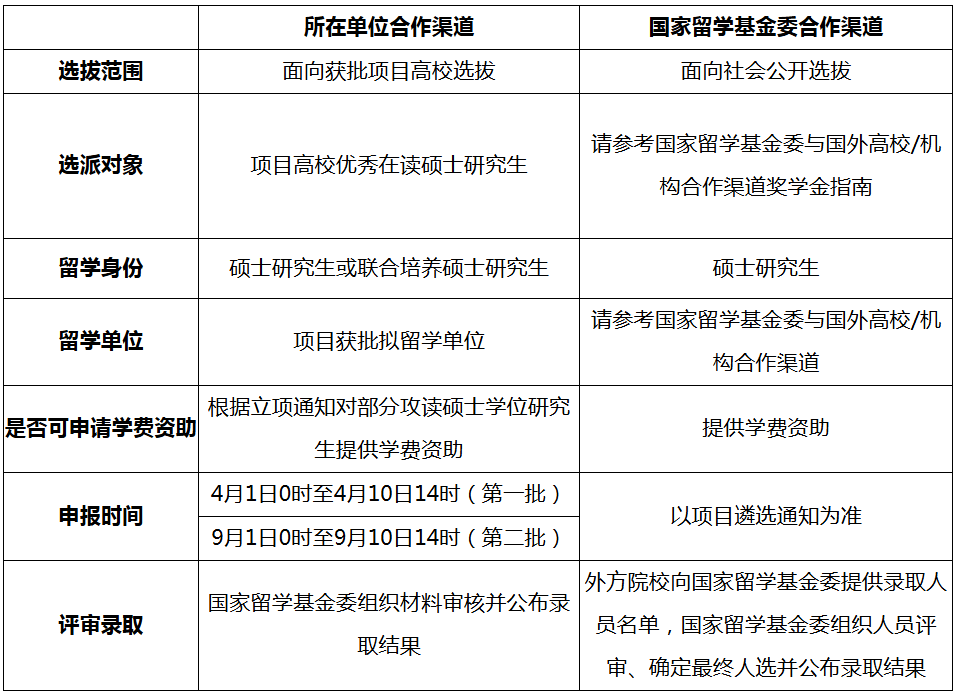 第四条项目下设国家留学基金委合作渠道、所在单位合作渠道(以下简称单位合作渠道)。国家留学基金委合作渠道选派类别为攻读硕士学位研究生,单位合作渠道选派类别为攻读硕士学位研究生和联合培养硕士研究生。